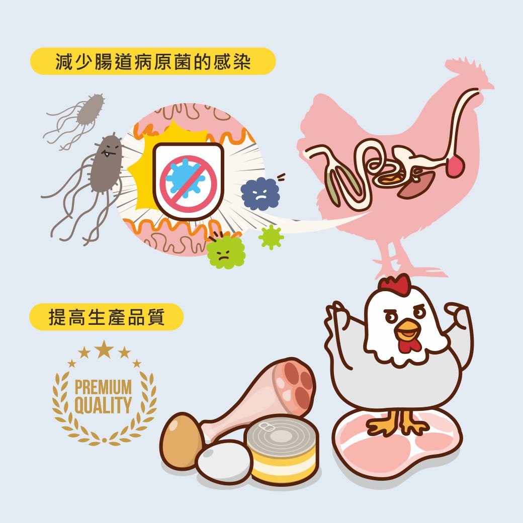改善動物的腸道健康和整體健康狀況,有助於提高肉、蛋、奶等產品的質量。