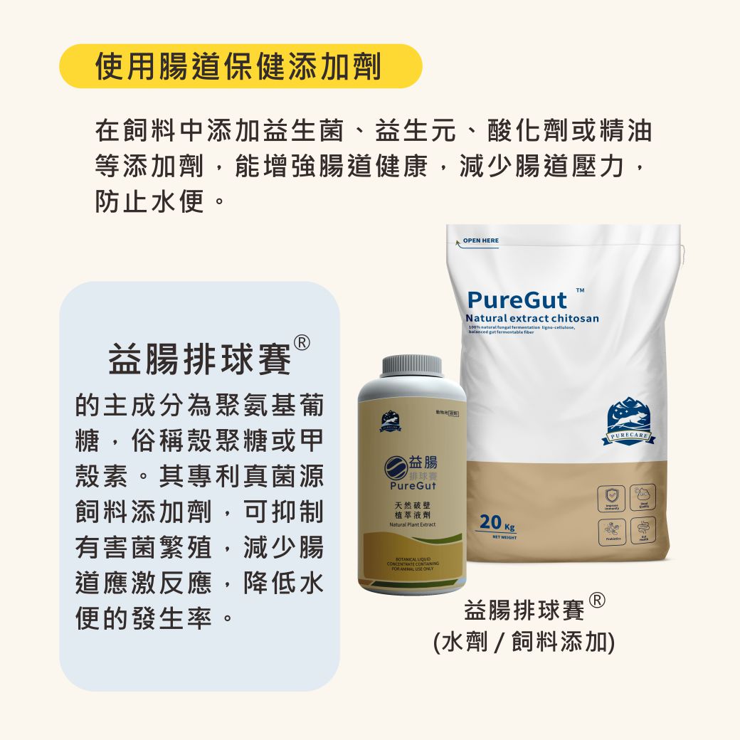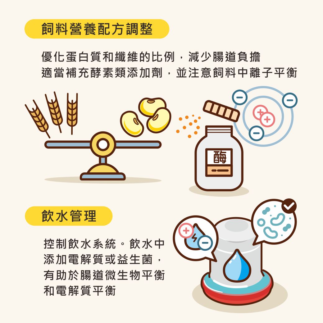 ➀減少或避免使用容易導致水便的飼料成分,增加容易消化的原料,優化蛋白質和纖維的比例,減少腸道負擔。