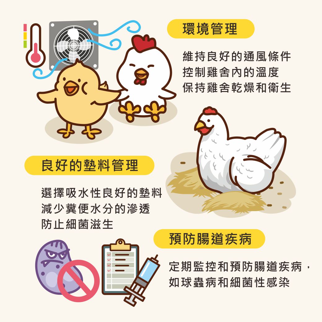 ➀維持良好的通風條件,保持雞舍乾燥和衛生。濕度過高或雞舍不潔會導致細菌滋生,引發腸道問題。