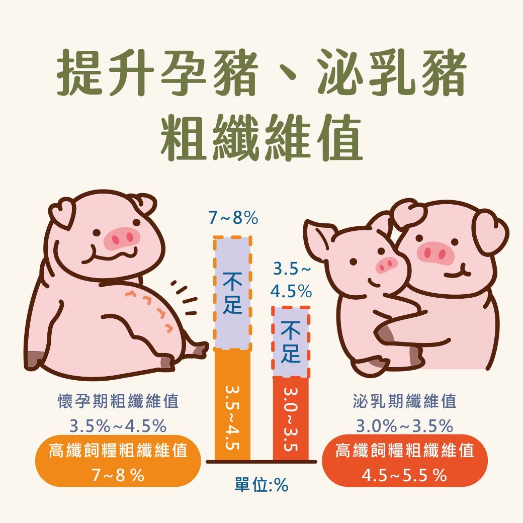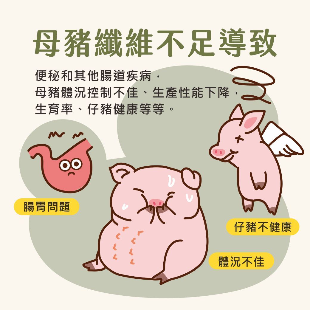 總體而言,母豬飲食中纖維不足可能會對其健康和生產性能產生不良影響,可能造成一些腸道問題如便秘和其他腸道疾病。或是母豬體況控制不佳、生產性能下降,生育率、仔豬健康等等。因此,為了確保母豬的健康和優良的生產性能,飼料纖維含量應該根據母豬的生產階段和體重進行適當的調整,以確保母豬有足夠的營養和纖維攝取。