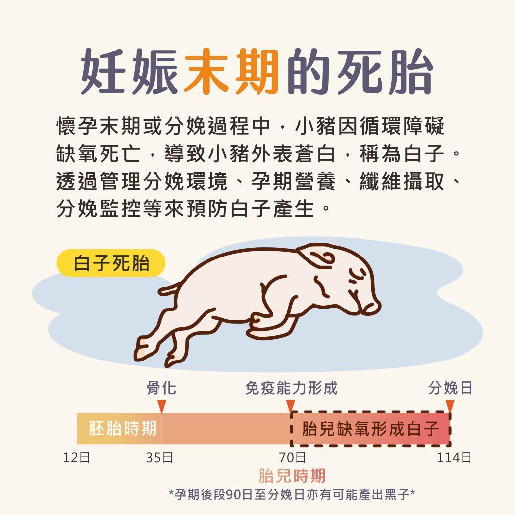 若母豬產程太長,小豬容易窒息死亡或是白子數量比較多時,可以觀查母豬的糞便狀態,另外在母豬料的配方中可以思考纖維是否足夠,高纖母豬料粗纖維含量建議5~8%