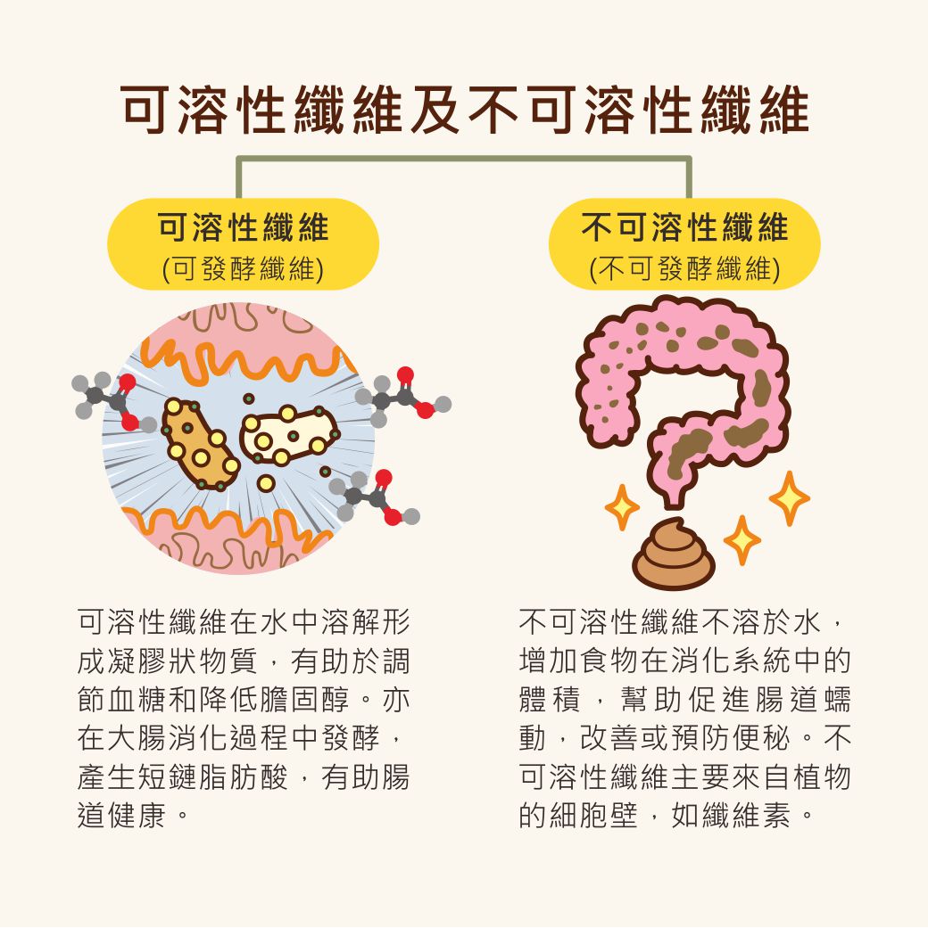 - 可發酵纖維:在大腸中能被腸道微生物分解,這類纖維有助於維持正常的腸道功能,促進有益菌群的增長,減少病原菌的生長機會,並有助於維持腸道pH值的平衡。