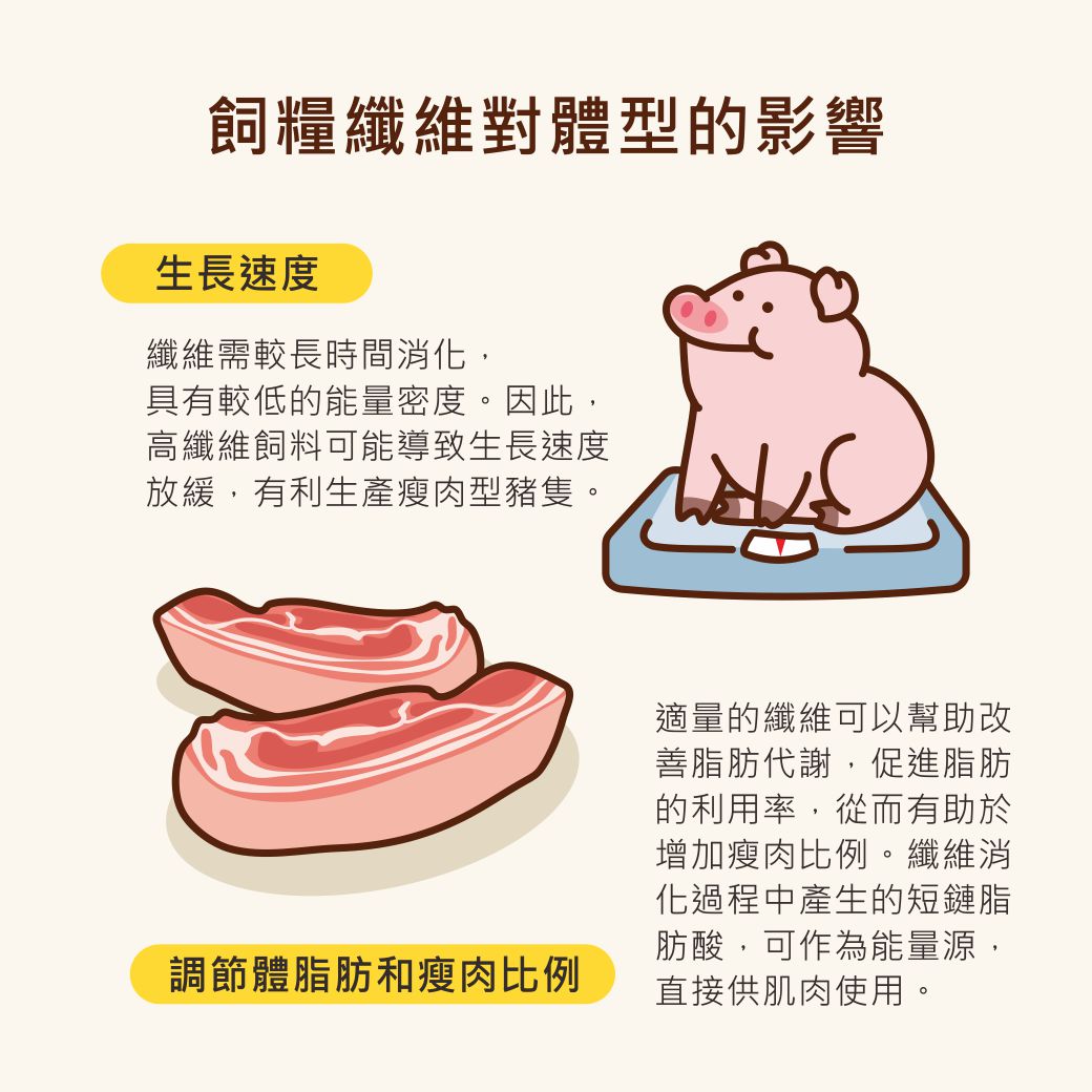 - 飼料中適當的纖維含量有助於改善豬肉的質量,如肉質的多汁度和口感。纖維有助於肌肉水分保持,減少烹飪損失,使肉質更加嫩滑。