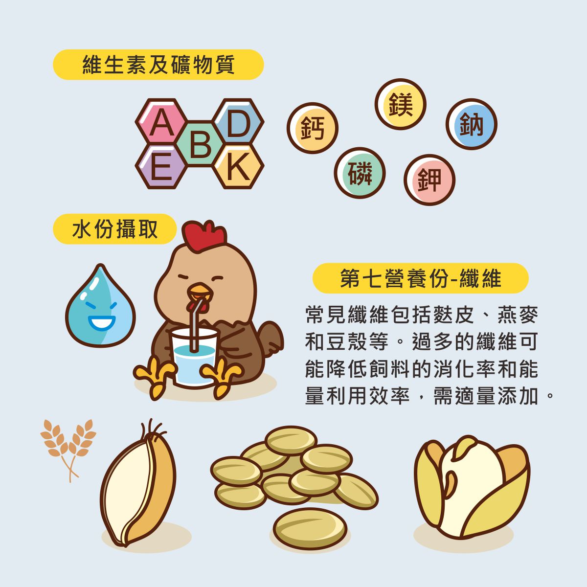 肉雞的飼料營養需求主要集中在蛋白質、碳水化合物、脂肪、維生素、礦物質、水分這六大方面,以確保它們的快速生長和健康,而第七營養份_纖維,在動物福祉的潮流下,也越來越形重要。